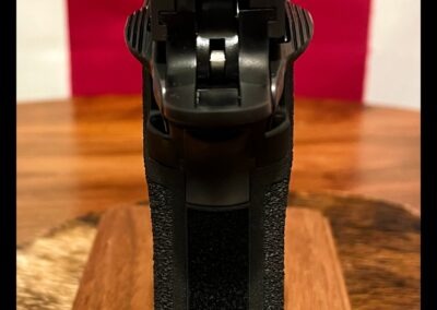 • Ergonomics: Narrow grip profile with enhanced serrations and high beavertail for improved control; fully ambidextrous controls and reversible magazine release accommodate left and right-handed shooters